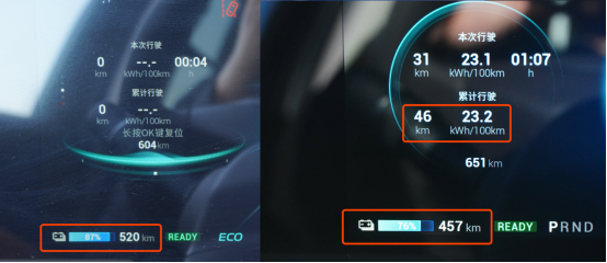 实际的表现为,我在出发时候清零了小计里程,表显剩余续航里程为520公里,行驶了46公里之后,表显剩余续航里程为457公里。