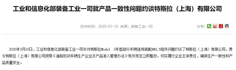此外,工信部还在3月10日因Model 3车型部分车辆违规装配HW2.5组件问题,约谈了特斯拉(上海)有限公司,责令其按照《道路机动车辆生产企业及产品准入管理办法》有关规定立即整改,切实履行企业主体责任,确保生产一致性和产品质量安全。