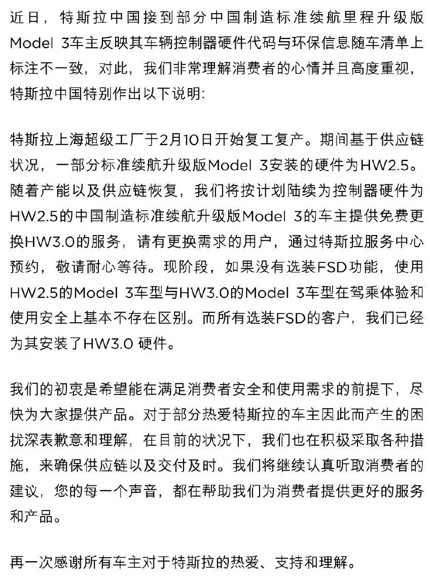 3月3日,特斯拉已在官微中承认实际装配芯片与备案不符的情况,该行为开始的时间节点为今年2月10日复工后,并在回应中给出解决方案:基于上海超级工厂供应链状况,一部分标准续航升级版Model 3安装的硬件为HW2.5,随着产能以及供应链恢复,特斯拉将按计划陆续为控制器硬件为HW2.5的Model 3车主免费更换HW3.0。