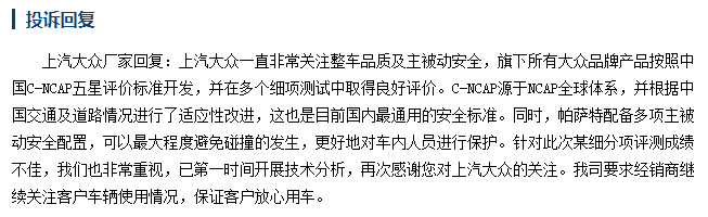 事情发生后,很多帕萨特车主表示对此结果难以接受,并且开始在网上投诉帕萨特结构设计缺陷、车身材料减配,要求厂家给出合理的解决方案。