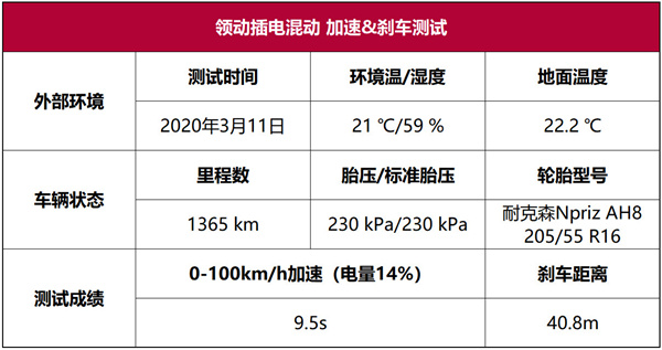 在一开始的加速测试环节,领动插电混动的表现就让我眼前一亮。考虑到有部分用户买了插电混动车之后会将其当做燃油车开,所以对于插电混动车我们都会分别进行有电和亏电两种状态下的测试。以往我们测试过的大部分插电混动车在亏电状态下动力都会有所减弱,零百成绩自然就会比较慢,但是领动插电混动是个异类,这次测得的最佳零百成绩9.5s竟是在电量仅有14%的状态下获得的。14%电量可以视为这台车日常行驶的最低电量,低于这个电量时车辆就会一直强制启动发动机充电。