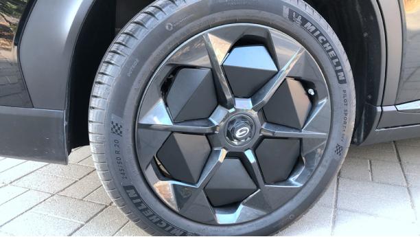 Aion LX在20寸的轮圈上面还加了一个塑料的轮圈盖,这可不是简单的钢制轮圈遮羞盖,而是为了提高续航及加速所采用的空气动力学设计。