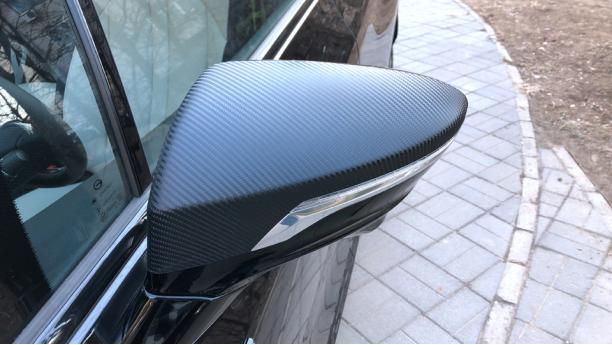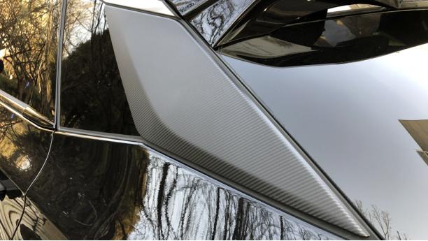 顶配的Aion LX在车身外部使用了部分碳纤维材质,包括碳纤维的后视镜壳和C柱区域的碳纤维饰板。