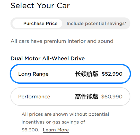 这时候我们再对比美国Model Y和美国Model 3的差价可以看到,同样是长续航版本,Model Y的价格为52,990美元,而Model 3是48,990美元,差价仅为8.16%。