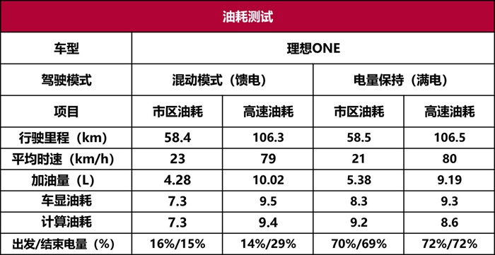 可以看到在馈电的混动模式下,理想ONE的市区油耗依旧能达到7.3L/100KM,可以说是非常的省了。如果同样级别、同样加速能力的纯燃油SUV,在平均时速23km/h的工况下,油耗定然是迈进两位数的。不过也可以看到,在高速部分理想ONE跟传统燃油车却有点颠倒。这个主要是因为在馈电状态下,车辆为了保持电量及兼顾动力输出,1.2T增程器会进入高负荷工作,优先消耗油量,来保证用户的驾驶体验,这种情况下对燃油的消耗量会更大。