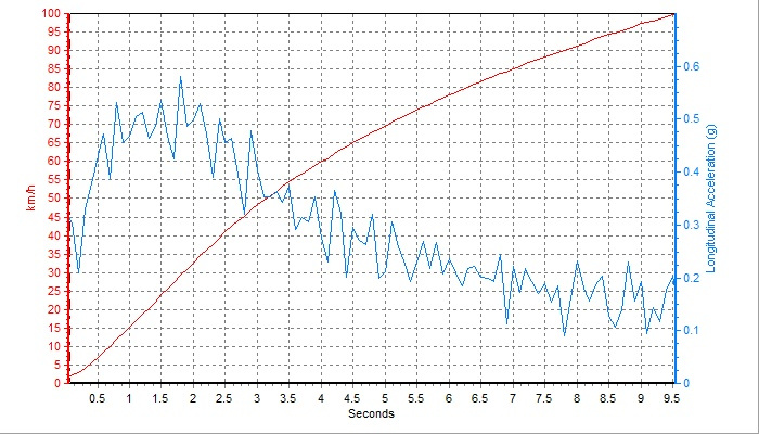 可以看到即使是最快的弹射模式,但理想ONE的起步G值也仅在0.5G左右徘徊,跟其他比较猛列的电动车相比,理想ONE的加速感受还是比较温和。最终我们做出的百公里最佳加速成绩为6.5秒,与官方数据保持一致,这个是值得好评的。因大部分纯燃油车(尤其是涡轮增压车型)的加速成绩受气温影响因素较大,而像理想ONE这种以电机驱动的车型则能较为轻易地做到稳定数值的加速。