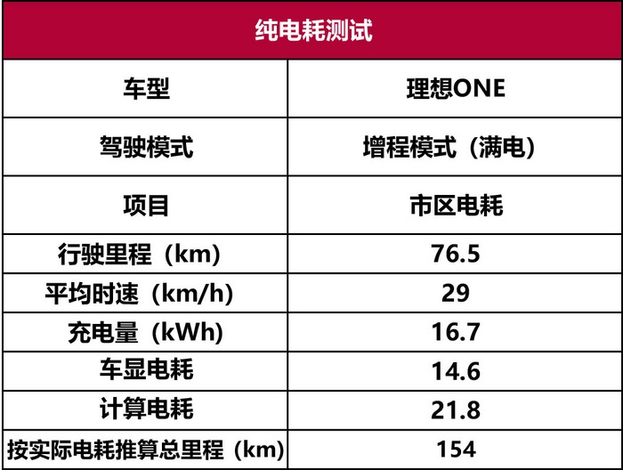 不过这些底盘特性可能并不是消费者的主要关注点,作为一台增程式汽车,40.5kWh的电池加身,能让它获得更经济的市区通勤成本。经过我们的实测,理想ONE在平均时速29km/h的工况下,能纯电行驶154km(因为SOC低于17%就无法纯电行驶,理论上来说可供纯电行驶的电量只有33.6kWh)。这种工况与市区通勤较为接近,但这个续航表现无法满足消费者一周的通勤需求。