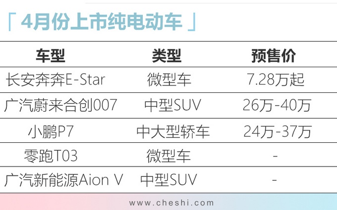 网上车市对即将在4月份上市的重磅纯电动车型进行了梳理,共有广汽蔚来合创007、广汽新能源Aion V两款SUV以及小鹏P7 (配置|询价)、零跑T03、长安奔奔E-Star (配置|询价)三款轿车。其中,合创007与Aion V均基于广汽第二代纯电专属平台打造,轴距达到2919mm,比丰田汉兰达长。在售价方面,长安奔奔E-Star补贴后7.28万元起,预计是这五款车型中售价最低的一款。