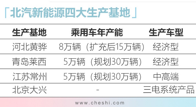 北汽新能源目前拥有北京采育、青岛莱西、河北黄骅、江苏常州四大生产基地。其中,北京采育基地为试生产基地,主要生产动力零部件以及动力总成产品;青岛莱西基地定位为经济型新能源乘用车生产基地(EX3、EU5 (配置|询价)等);黄骅基地规划定位为经济型纯电动汽车生产基地(EU换电版);江苏常州基地规划定位为中高端新能源乘用车生产基地(EX360等)。