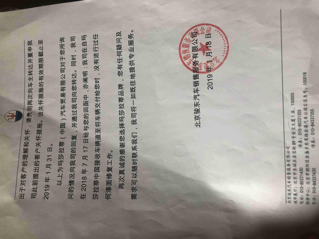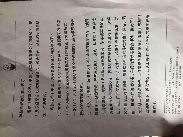 017年10月15日,本人在北京骏东汽车销售服务有限公司订购全新白色玛莎拉蒂QP一辆(工厂编号M43446、车架号254617)。新车买回后发现该车多处存在拆装痕迹,并且存在油漆脱落以及保险杠中网格栅松动掉落现象。随后本人将车辆送往中国权威法定鉴定机构(中国检验认证集团北京分公司)进行检验,检验结果证实:“车辆左后部位、右后部位漆膜进行过修复处理,右后车门不排除进行过二次喷漆”。本人凭对车辆漆膜的《鉴定意见书》向北京骏东公司讨要说法得到的回复是:玛莎拉蒂(中国)汽车贸易有限公司向意大利玛莎拉蒂工厂查询后得到的回复是:“车辆多处维修喷漆的事实,属于玛莎拉蒂意大利工厂的正常生产管理标准”。无奈之下本人公证封存车辆保全证据,多次向消协以及相关主管部门投诉,现已维权一年无果,特向贵平台投诉以及寻求帮助,希望能够尽快实现维权!