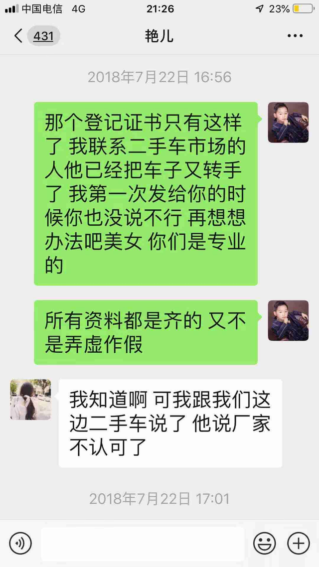 首先,我提供了置换补贴需要的所有材料,且两次发给她资料时,她均未提出异议,也未在第一时间告知我机动车登记证书应第一页第二页整体拍,这是销售人员的工作失误,不应让我这个普通消费者为其失误买单。而且,我并没有少提供材料,只是一直无人告知我机动车登记证书应第一页第二页整体拍,以此理由作为厂家审批通不过的理由,作为消费者不能理解也不能接受。其次,作为安徽泽通汽车销售服务有限公司,不能应销售人员的离职,就对离职人员的顾客不管不问,我们作为消费者不是销售人员的顾客,是作为安徽泽通汽车销售服务有限公司的顾客。