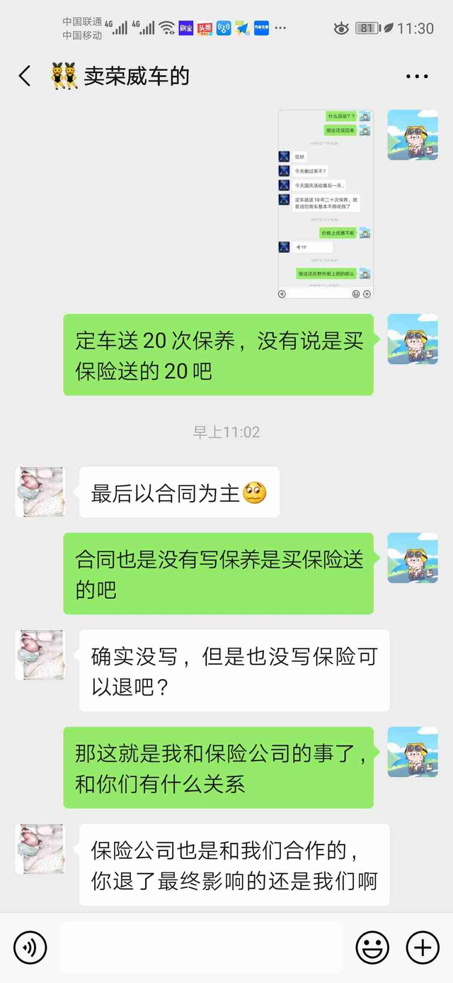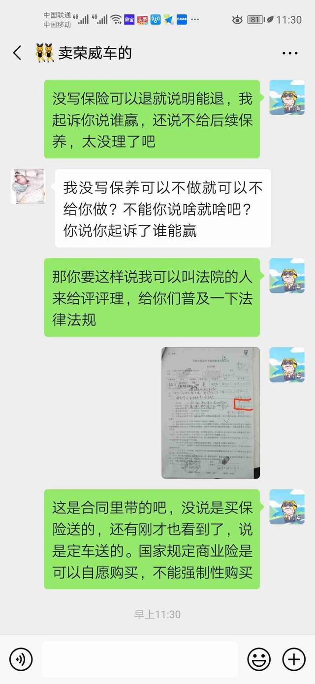 荣威4s店国庆搞活动说定车送20次保养,然后定了车。国家规定商业险可以自愿选购,全款付尾款购买车时4s店说商业险不能不买,必须得从他们这买商业险。去保险退保商业险时,保险公司和4s店人员打完招呼,4s店人员说如果退保后续保养不能享有,定车活动送的20保养也不能享有。20次保养明明是国庆订车活动送的,现在反而和商业险绑定了,合同中也没有明确写出购买商业险不可退保,退保不享有后续保养。分明是在威胁客户,强行捆绑销售。
