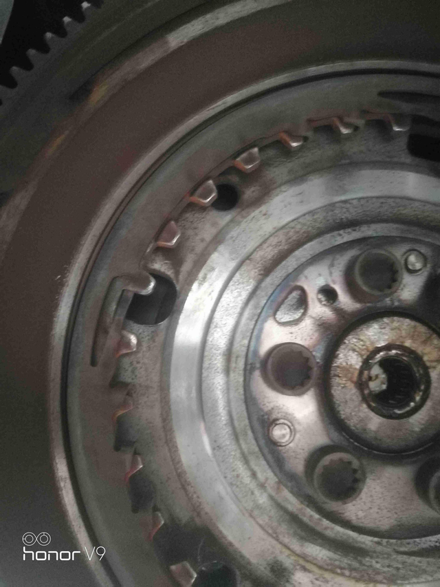 下图是在4月份更换双离合总成时拍摄的飞轮照片,灰尘擦掉后铮亮铮亮的。此款DSG双离合变速器的通气孔开在下面,至飞轮容易受到路面水和灰尘的影响,一汽大众认为只要飞轮不是干干净净就是浸过水,不予维保。四月份入厂换双离合时也做过整车检测,根本不说飞轮或倒档有问题。在拆开双离合后,才建议我更换飞轮,理由是飞轮有锈迹,最好趁机更换。并且他们技术经理也说了,不换也没事,以后可能有响声,影响不大。而现在这成为他们要求我自费更换飞轮的理由,说换了飞轮后倒档就好了。我怎么也想不通,我倒档一直好好的,我的飞轮原来能够支撑我的倒档正常运行,更换双离合才导致倒档严重冲击,责任明明在厂方。再说,前进档顿挫问题厂家9年没有帮我解决,从新车就开始顿挫,又召回又延保,多次维修怎么也修不好,最后才更换双离合总成,不但没解决前进档的问题,还搞坏倒档。