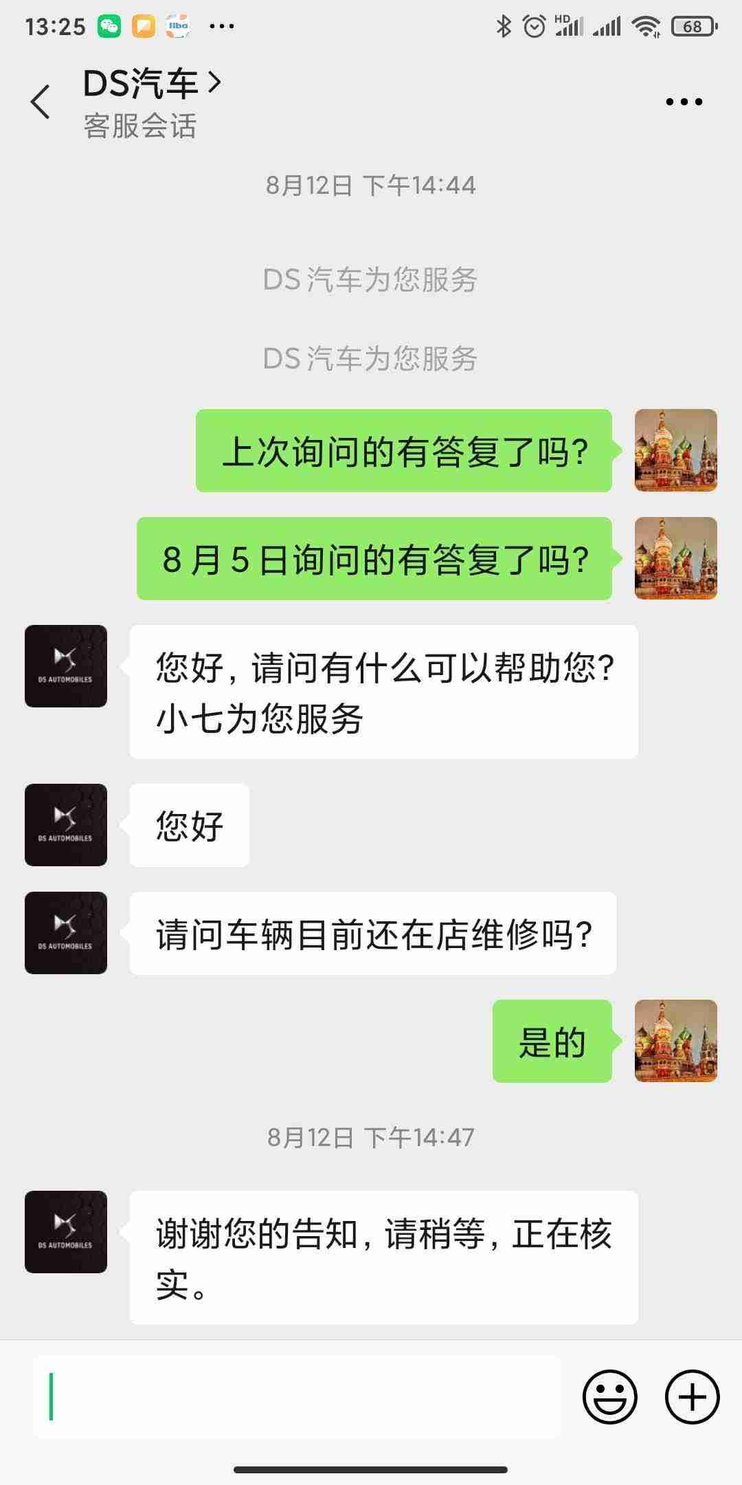 今天已经9月24日,距车辆送修已经整整51天。期间多次主动通过电话、微信、微博联系DS,到答复永远已经向有关职能部门反映,请耐心等待。从没有接到过个回复电话或者告知明确解决方案。