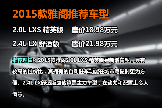 总结:2015款雅阁并未带来全新的外观与内饰,但在增补车型以及优化配置基础上,完成了一次升级,这一点更能赢得消费理念越来越成熟的群体的支持。今天对雅阁的推荐,我们没有以高配置为着眼点,而是根据性价比与实用相结合的平衡原则,着力推荐了2.0L和2.4L两款中低配车型。希望大家尽量节省购车预算的前提下,能享受到2015款雅阁给您和家庭出行带来舒适安全以及快乐。