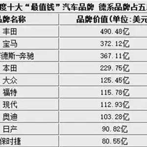 汽车品牌价值是衡量一个汽车企业综合实力的重要指标之一,全球知名的Interbrand公司发布了“2015年全球最具价值品牌100强”排行榜,乘用汽车行业总共有14个品牌入围百强,丰田继续蝉联汽车品牌价值桂冠,相比之下大众则成为唯一一个价值下跌的上榜汽车品牌。我们就此盘点了排名前10位的汽车品牌,看看有没有你家的汽车?