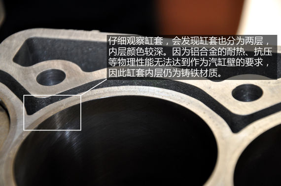 这种缸套叫做“预埋式铸铁缸套,耐热负荷性强,也能在一定程度上提升发动机的升功率。当然,这么做最显著的效果是缸套的重量因为加入铝合金材质得以减轻。缸体与缸套之间的“黑暗沟壑”,是用来流经冷却液的。
