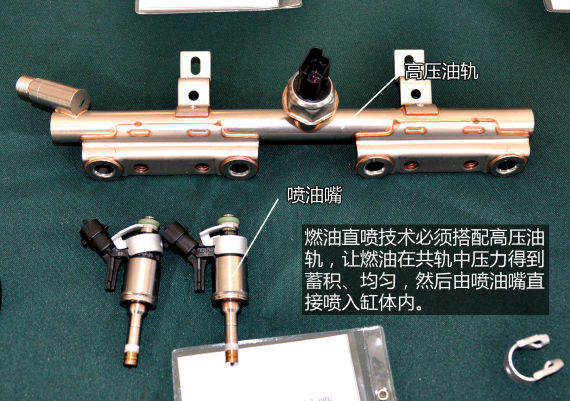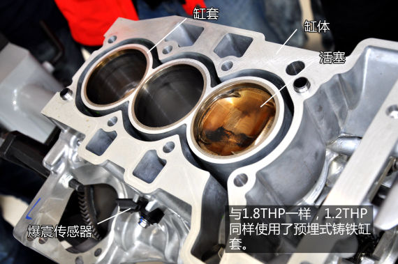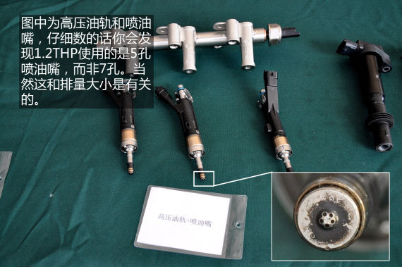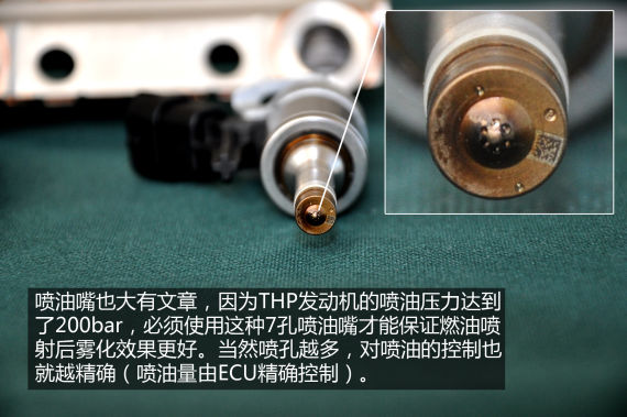 THP发动机的缸体内部,这里主要介绍喷油嘴和活塞,当然1.2THP发动机当中也使用了这些技术,只不过细节之处略有不同。