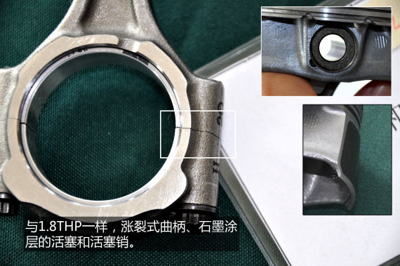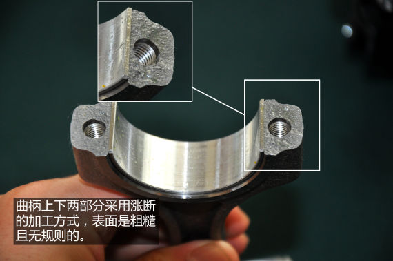 发动机部分,最有优化潜力的方面就是摩擦损失。活塞下面是曲柄,仔细观察就会发现,曲柄的上下两部分截断处的表面是粗糙的。原来,加工时曲柄采用了涨断的加工方式,相比传统的切断,这样做可以最大限度保证曲柄结合后的圆度,而切断则或多或少地牺牲了圆度。只有与圆形的曲轴完美配合在一起,才能最大限度降低此处的摩擦。
