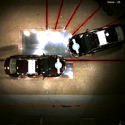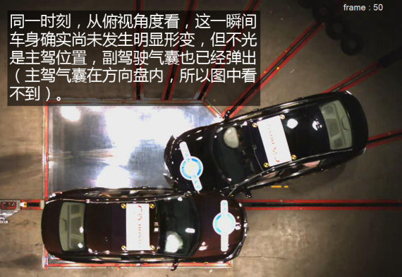 对于这次碰撞试验,目前能得出的结论是:两车的气囊弹出都非常及时。由于是25%重叠率加15°斜角,因此两辆车都产生了不同程度的旋转,其中棕色目标车因受到来自子弹车15°角的侧向冲击,位置和角度的偏转更大。