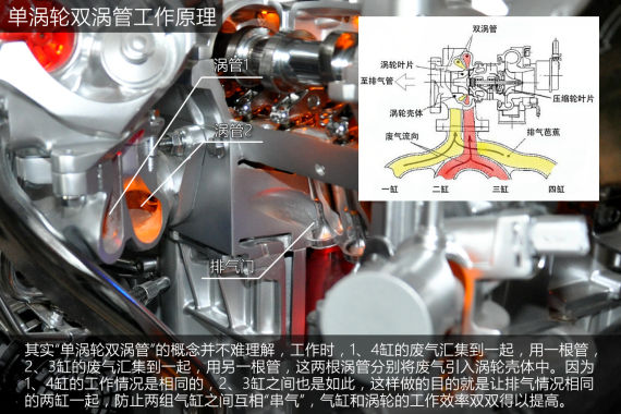 涡轮增压我们已经很熟悉了,像小惯量涡轮增压器、电子旁通阀等均已得到普及,一些技术含量较高的国外发动机也有配备(例如标致的THP系列),眼前这台MGE 2.0T发动机上自然也得到应用。同样的,像4-2排气歧管这类结构,也出现在了这台2.0T发动机上面。所谓4-2排气歧管,就是我们常听说但不常见的“单涡轮双涡管”结构。