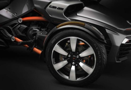 Can-Am Spyder F3的整体重心下移和很有力度前脸设计,让F3显得特别具有运动范。而且F3与以往的Can-Am Spyder不同的是,采用裸版外形设计,车体框架、后摇臂和引擎基本处于裸露状态使新款F3刚猛风格立显无余。810mm座高在Can-Am Spyder家族中是最低的。F3配置了Fox Podium前减震和Sachs的中置单后减震,减震行程都比老款的短一点。
