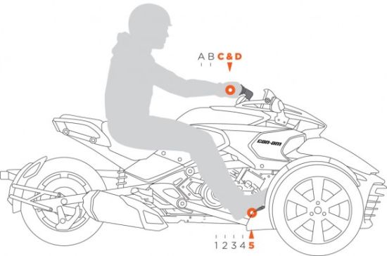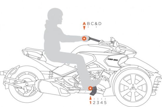 Can-Am Spyder F3的驾姿可调系统可以让骑士根据自己的身高、臂长或驾驶风格,来分别调整F3手把、脚踏的相应位置。F3手把和脚踏的组合调节位置,可以将骑士的驾驶风格在街跑车姿态和巡航车驾驶姿态之间进行转换,这是非常实用的人性化设计也是F3重大的技术亮点。