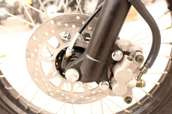 鑫源魔术师前减震为33mm正置式,中置连杆式后减震,前后减震总体感觉明显偏于舒适性。前后盘式制动,前双、后单活塞卡钳。前制动可说是中规中矩没有什么可以评说的,后制动的线性刹车反应很不错,不像某些后盘式制动的车:轻踩没有效果,重踩直接抱死。