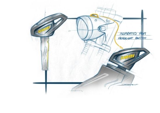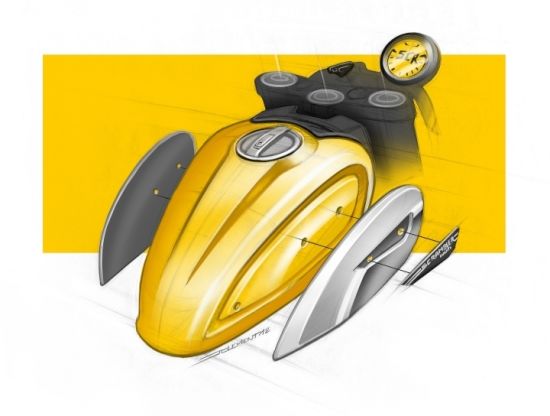 从设计师原厂手绘稿上我们可以看出,搭配着鸥式摇臂,结实的车辆外形,塑造出SCRAMBLER现在融合复古与现代的设计。设计师在油箱的左右两侧分别增加了两块金属饰盖,并在金属饰盖上锁上车身铭板,这样的设计可以在不少经典老车上看到,当然,SCRAMBLER的设计师也将这样的设计理念应用在车款上。经典的侧置单表设计,不过多的修饰,采用全数码化的液晶仪表,对于许多人来说少了指针转速的仪表来说似乎少了一点过去的热血感,不过着重在骑乘乐趣的SCRAMBLER在设计发想上遵照着车辆原始的理念出发,也因此功能性一样不缺。