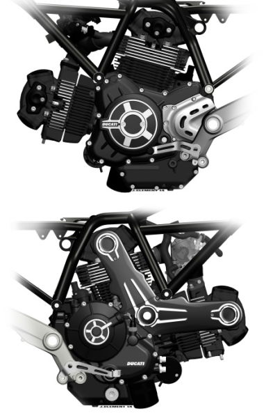 引擎、车架、排气系统采用紧凑设计思路,并没有太多的空间,引擎采用803cc风冷L型双缸引擎,单缸两气门的设计,没有为了一味追求高效能而采用DOHC和多气门设计,继续大耍复古范儿。