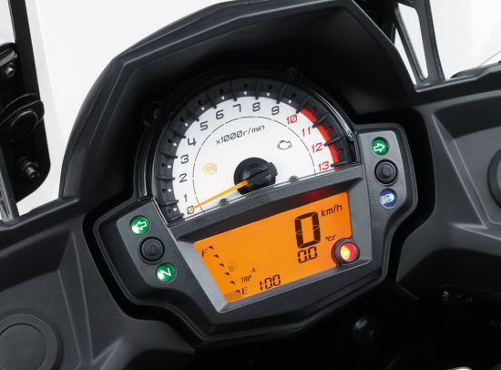 该款多功能仪表使用堆叠组合的方式,融入了现款ER系列,易读,美观的特点。除了油位表,数字速度计,时钟,里程表和双闪灯提示功能外,新功能包括:剩余里程显示,平均,/瞬间燃油消耗率和经济模式灯功能。