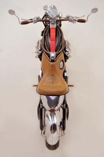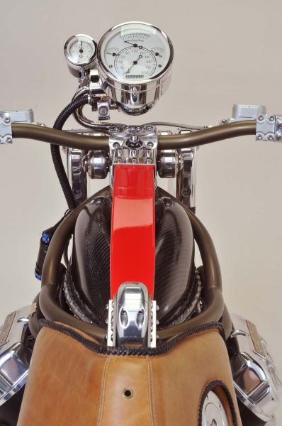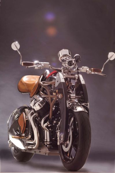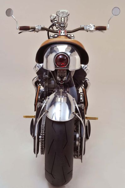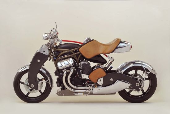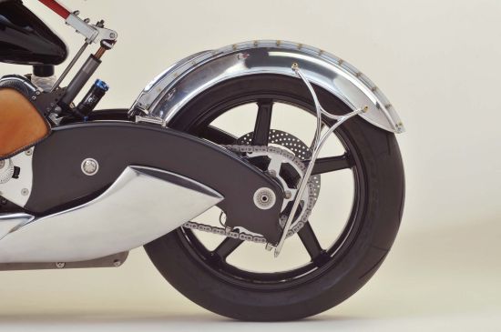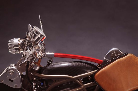 这辆订制车超越了传统外形设计,整体设计显得非常非常激进犹如一头强健的雄狮。精钢结合碳纤维制造的前后摇臂让这辆车风格迥异,而且做工精湛到很难相信这是由纯手工制造的。搭载了Motus MST V4上的1650cc水冷V型4缸引擎,原发动机有170匹马力输出,但是订制版比恩维尔传奇对其进行重新调校并加装了增压装置,最大输出马力可达300匹。