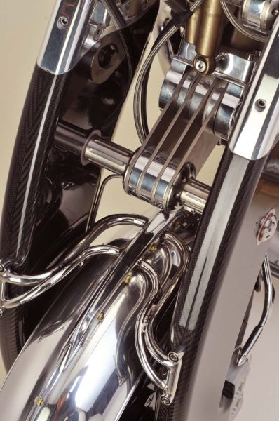 正是因为张力弧形梁这个设计,悬挂系统采用和攀爬越野机车类似的设计。此外比恩维尔传奇还配置了ISR制动系统,BST碳纤维订制轮毂,精心手工制作的附加配件。透镜大灯和仪表采用了一个精妙的弧管连接设计,每一台比恩维尔传奇的座椅都是按照客户的要求和臀型特别订制的。比恩维尔传奇的前后摇臂设计完全相同,只是操作形式和构造稍有不同,这样的设计形式让比恩维尔传奇操控起来会更加轻而易举。