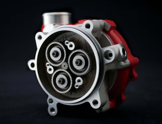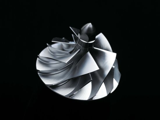 H2的增压叶片透过5轴CNC 切削整块锻造铝材而成,其直径只有69mm。叶轮共有六大六小的叶片,基座上刻意设计的细小沟槽能帮助气流的流通。在一大气压下,当进气管路的空气流速达到每秒100m 时,增压叶片在每秒可输送200升的空气,并经过增压后可达2.4倍的空气压力。
