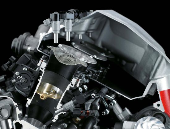 集气室容量为6公升,并使用铝合金材质,其目的有二,一是靠铝材本身的热传导效率,帮助通过增压叶轮的空气降温,另一个是铝材的刚性与精度,才能提供内部增压2倍后的气密性。而喷嘴与进气管口间使用金属网,据Kawasaki 表示将有助于燃料雾化与降温,这项设计目前也在申请专利中。