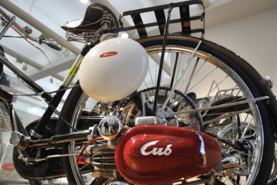 早期安装本田发动机的自行车,白色的汽油箱搭配红色CUB发动机,此车在当时非常时髦。
