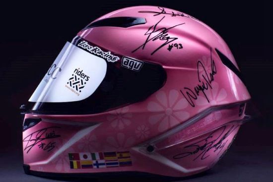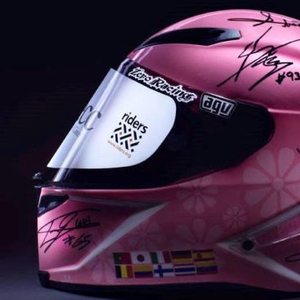 您觉得迄今为止哪款头盔售价最高?马奎斯2014年度冠军黄金纪念版头盔?AGV罗西碳纤维竞技款?这些头盔确实价格不菲,但是它们的价格还都不够用“天价”一词来形容!日前一顶粉红色的AGV Corsa头盔售出价格高达31万美元(拍卖价)!这顶头盔上面有12位摩托车世界冠军亲笔签名,其中包括马奎斯、罗西、佩特罗萨、洛伦佐四位今年MotoGP前四强,和阿格斯蒂尼、韦恩、尼尔图、卡皮罗西、艾利克斯、罗素、兰迪等超重量级退役冠军车手。