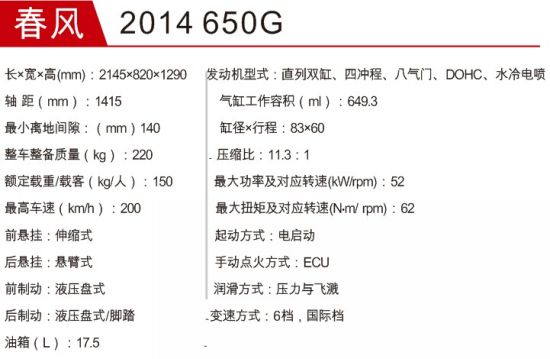 春风650G参数配置