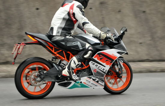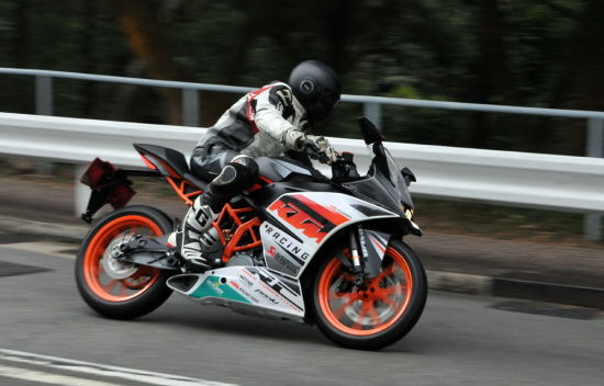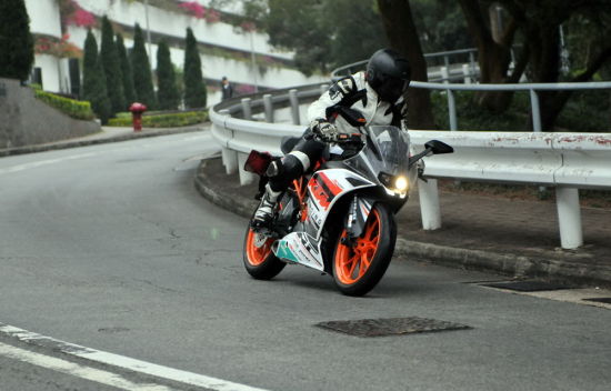 试骑时Alex曾在安全情况下,长时间放开双 手,只以双膝夹油缸,也可轻易操控车身作正常转向。所以当加上推胎和外挂动作后,RC390处理弯道的能力,实在让人大为赞赏。