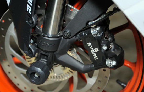 KTM摩托车用料一向好,RC390也不例外。WP倒立前叉直径粗达43mm,其他对手是正叉,直径只有37mm。RC390的避震虽然粗壮, 设定其实偏软,适合体轻骑手作为街道用车。如果双人骑行快跑,避震设定最好再作调较。当其他对手的重量在153-183kg之间时,RC390只重147kg。更有ABS作标准配备。除了拥有同级最强马力重量比之外,车架和重心也 拥有很好的平衡性。轴距也是最短的,只有1340mm,比起日本250/300级对手更短更灵活。