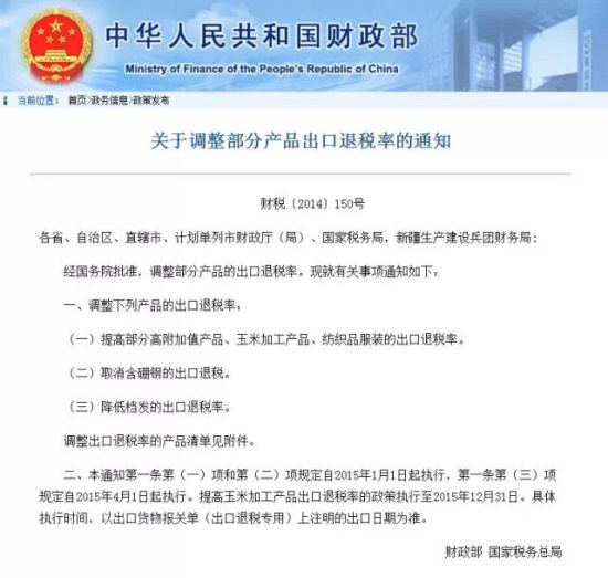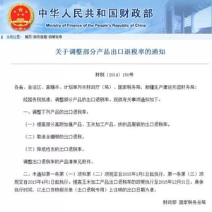 二、本通知第一条第(一)项和第(二)项规定自2015年1月1日起执行,第一条第(三)项规定自2015年4月1日起执行。提高玉米加工产品出口退税率的政策执行至2015年12月31日。具体执行时间,以出口货物报关单(出口退税专用)上注明的出口日期为准。