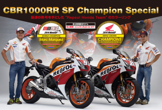 本田公司为了纪念威爽本田车队在Motogp2014年赛季的杰出表现,于2015年3月8日限定发售“Repsol HONDA Team”车身版花的CBR1000RR冠军特别版。