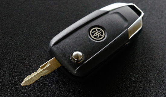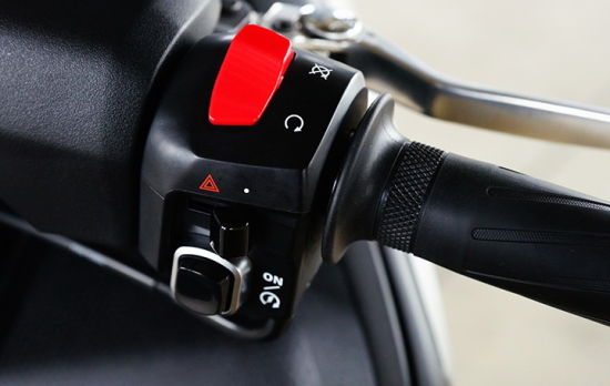 右把手开关部分,从上到下分别为引擎运转/熄火开关、警示灯开关与电启动/电门开关。以往的电启动按钮,这次改为除了具有电启动功能以外,同时还兼 Keyless 免钥匙系统的龙头解锁并开启电门的操作按钮,这颗按钮的触感极佳,摸起来很像按单眼相机快门键的扎实感。在锁头部分,这次采用 Keyless 免钥匙系统的 TMAX 530,不论是操作电门开关,或是锁龙头及进入驻车灯等功能,都以芯片锁在感应范围内为前提,由这区域操控;左右键功能分别介绍,左键短按为开坐垫,长按则为在龙头锁锁上的情况下,开启警示驻车灯功能电源,右键短按为关闭电门,长按则为将龙头转至左侧最底的情况下,锁上龙头使用。