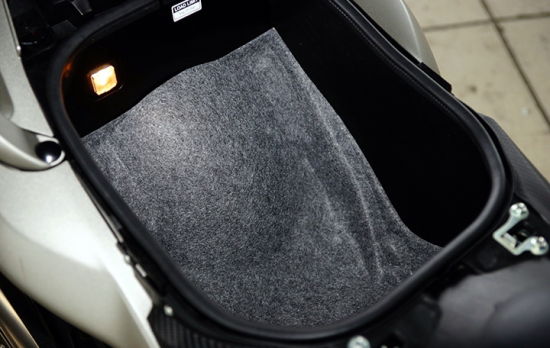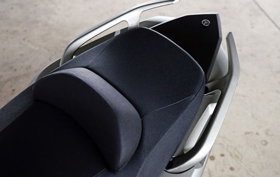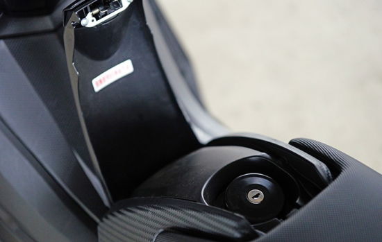 坐垫部分则与2012~2014款坐垫差异不大,不论前后座舒适度都还是很好,前座的腰靠垫也能进行调整,方便适应不同腿长的骑士。将坐垫打开后,车箱空间并无升级,不过依然能塞下一顶全罩式安全帽加上一套两件式雨衣及手套等物品。不过坐垫的绞链这次也有升级,旧款的绞链为铁制品,新款的则改为铝合金铸模制品。坐垫下依然有空间可以放置维修工具包与安全帽绳锁,因为TMAX 530的车箱内安全帽扣点较深,所以需透过安全帽锁穿过帽扣部分,再套至车箱内安全帽扣点,算是较为不方便的地方。