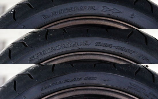 后轮的轮胎配置也与前轮相同,同为DUNLOP所制造的SPORTMAX GPR-100系列轮胎,规格则为160/60R15 M/C 67H。