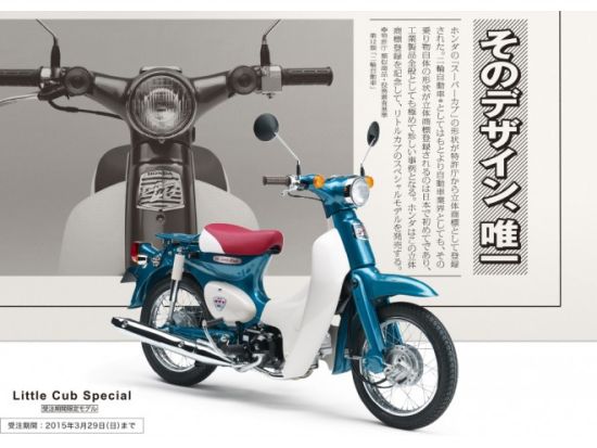 本田公司为纪念Super Cub通过了日本立体商标认证,推出全新配色的“Little Cub特别版”。这款Little Cub特别版定于2015年2月13日起于日本正式限期发售,至2015年3月29日发售截止,售价237600日元。