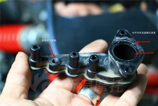4.节流阀塑料组件质量存在问题(位于引擎缸头盖正上方),抗高温性和韧性不足。由于黄龙引擎工作温度较高,致使节流阀塑料组件因过热融化、变形、易损,导致密封不严而漏油。(可明显看到接口处有因热融化、变形的迹象)。此接口与怠速马达相连接,部分黄龙600怠速马达易损,应该也与“热量”有着一定的关联。(此重要配件网络售价仅仅15元)