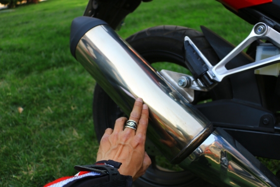 8. 本田CBR300R排气管的防烫问题确实有待解决,通过图片便可发现,本田CBR300R排气管表面因高温,金属表面已经产生色变情况。大培子调侃:这也是在提示车手在驾驶摩托车时,要穿长裤、摩托车裤或防护用具。