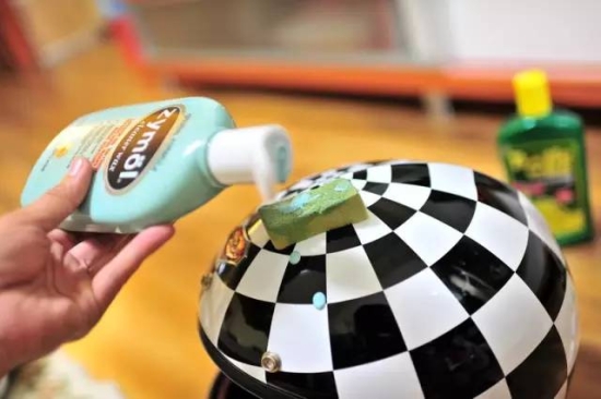 上面所说的各种东西基本上在汽车配件城都能买到,价格都不太贵!加上只要你会杀价,估计一两百以内都能搞定。首先你可以用小海绵滴上几滴液态蜡,然后完整地涂抹在头盔表层,等约两分钟,当液态蜡呈现半干的时候,再接着用吸水绵布,将上面的蜡痕全数均匀地推干净。这边切记吸水绵布是保持干燥的状态,不要有任何的水分!