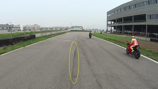 即使再规整的赛道(路面),也存在着不少的“地雷”(砂石、油渍、隔离线、湿滑路面、凹凸路面等等),这些“地雷”在潜意识中会告诉骑手:摔车哦!打滑哦!所以骑手的眼睛在行驶中会不自觉的去搜寻“地雷”(尤其是在过弯过程中),心理压力加大的同时产生恐惧。